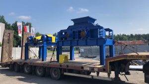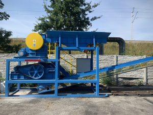 Two horizontal rollers rotate towards each other. Their surface is adapted to the specific material – in addition to flat, there are also models with serrated and grooved surfaces. The specific solution translates into a better grip (e.g., for larger pieces of raw material). One roller rotates in moving bearings, while the other rotates in stationary bearings and is pressed by a spring. Thanks to this, the machine provides the aforementioned aperture adjustment, while eliminating the risk of damage due to hard parts coming through.
